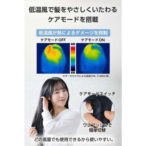 髪をやさしくいたわり、熱ダメージを抑えられる低温風のケアモードを搭載。独立スイッチなので、ワンプッシュで簡単にケアモードに切り替えられます。