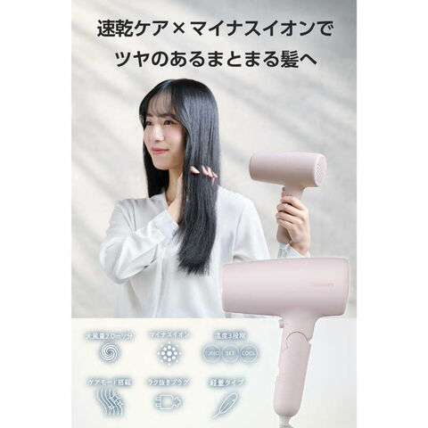 マイナスイオンが髪の広がりの一因となる静電気を低減。髪のツヤもアップします。 ※放出イオン量約1,000万個/cm3以上 当社測定法/当社比較検証法による