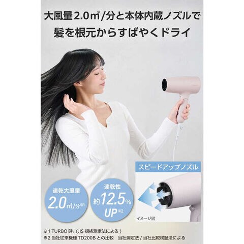 大風量の2.0m3/分(※1)と本体内蔵スピードアップノズルで、髪を根元から素早く乾かせます。速乾性約12.5%アップ(※2)で、忙しい毎日も時短でヘアドライができます。 ※1 TURBO使用時 JIS規格測定法による ※2 当社従来機種TD200Bとの比較 当社測定法/当社比較検証法による