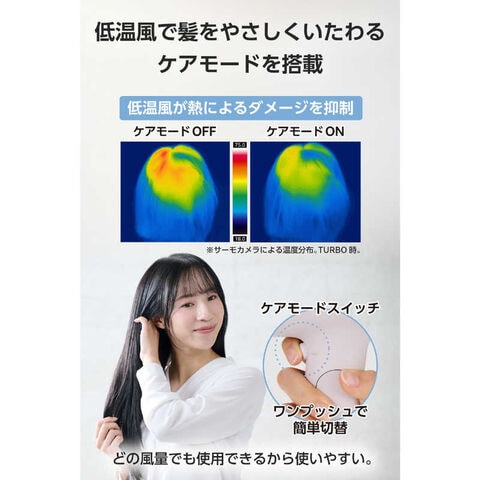 髪をやさしくいたわり、熱ダメージを抑えられる低温風のケアモードを搭載。独立スイッチなので、ワンプッシュで簡単にケアモードに切り替えられます。