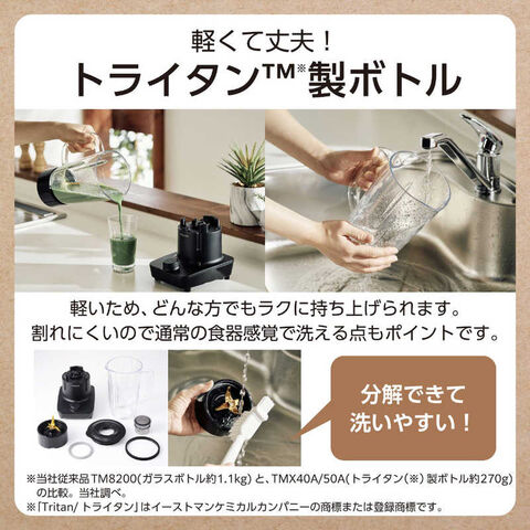 ※当社従来品TM8200(ガラスボトル約1.1kg)と、TMX40A/50A(トライタンボトル約270g)の比較。