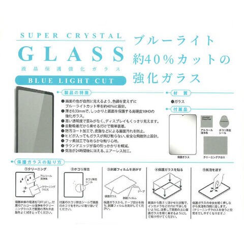 仕様1:[タイプ]ブルーライトカット : 画面の色が自然に見えるよう、色調を変えずにブルーライトカット率を約40%に設計。[エアーレス仕様]24時間後に気泡が消える[硬度]薄さ0.33mmで、しっかりと画面を保護する高硬度10HDの強化ガラス。[フッ素加工]なめらかな触り心地と快適な操作性[飛散防止設計]ヒビが入ってもガラスが飛び散らない、安全な飛散防止設計。