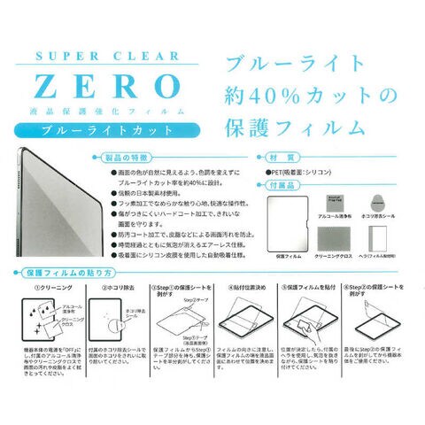 仕様1:[タイプ]ブルーライトカット(カット率約40%)[エアーレス仕様]時間経過とともに気泡が消える[自動吸着仕様]吸着面にシリコン皮膜を使用[フッ素加工]なめらかな触り心地と快適な操作性[ハードコート加工]傷がつきにくいハードコート加工できれいな画面を護ります[防汚コート加工]皮脂などによる画面汚れを防止[材質]PET(吸着面:シリコン)