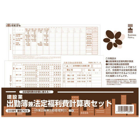 「建設業出勤簿兼法定福利費計算表セット」(建設70-S)は、国や元請などの指導により、見積書などに明記を求められるなど近年重要性が高まっている法定福利費を、日々の業務フローを大きく変えることなく簡単に計算するための帳票システムです。