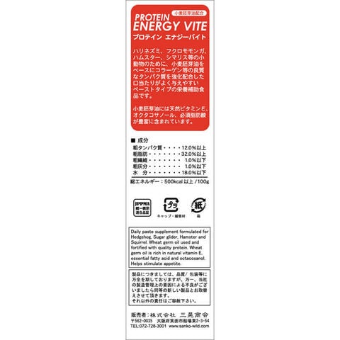フクロモモンガやシマリス、ハリネズミ等の小動物用の栄養強化補助食。