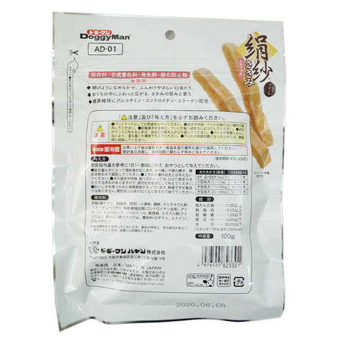 原材料:肉類(鶏ササミ、鶏胸肉、鶏肉)、小麦粉、糖類、タピオカでん粉、コラーゲンペプチド、魚軟骨抽出物(コンドロイチン含有)、グリセリン、トレハロース、ソルビトール、膨張剤、ミネラル類(ナトリウム)、ポリリン酸ナトリウム、着色料(クチナシ、マリーゴールド)、グルコサミン