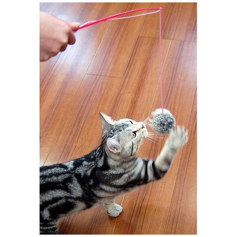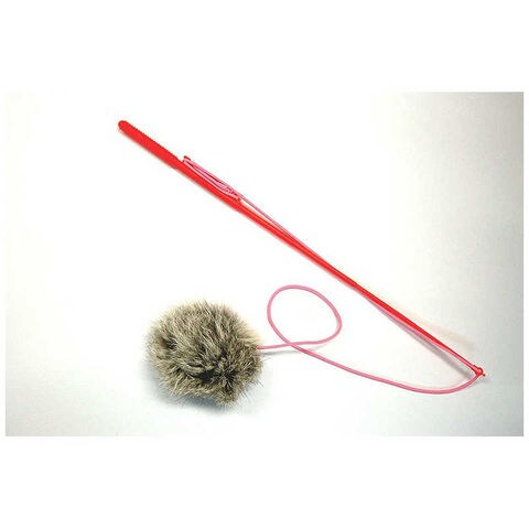 ●くっついているのはウサギ毛の大きなファー!まん丸でゴージャスなモチーフがついた釣り竿タイプのおもちゃです。生きているように動かして、猫の興味を引き寄せます。