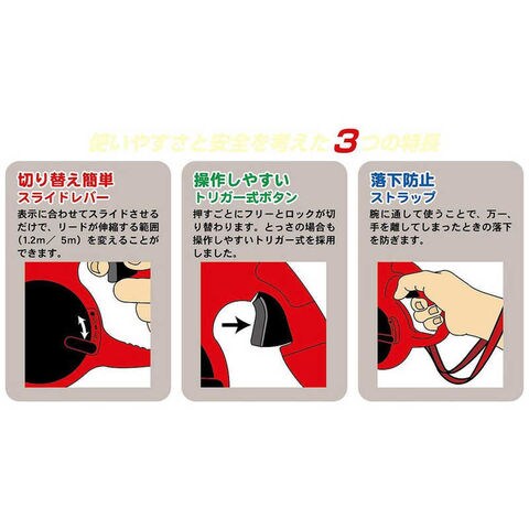 フリーの長さが選べる2段式伸縮リード。押すごとにロックとフリーが切り替わるトリガー式。