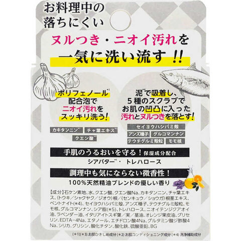 お料理中の落ちにくい、魚のヌルつきやニンニクのニオイ汚れを洗い流すキッチン用手洗い石鹸。
