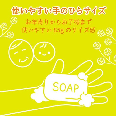 石鹸のサイズは使いやすい手のひらサイズの85gでお子様からお年寄りの肩まで使っていただけます。