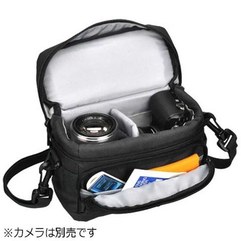 ●キットレンズを装着したミラーレス一眼カメラと交換レンズの収納に適したショルダーバッグ。