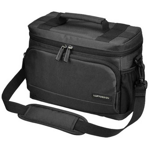 ●キットレンズを装着した一眼レフカメラと交換レンズ1本の収納に適したショルダーバッグ。