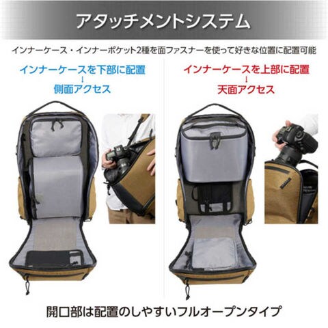 カメラのインナーケース、インナーポケット2種を、面ファスナーを使って好きな位置に配置できるアタッチメントシステムを採用しており、その時々で使い分けたり、重心バランスを変更したりが可能です。開口部は配置のしやすいフルオープンタイプです。