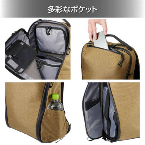 インナーポケット2種、天面のファスナーポケット、ボトルを収納できる側面のポケット、側面内側のポケットなど、小物を細かく分けて収納することができます。