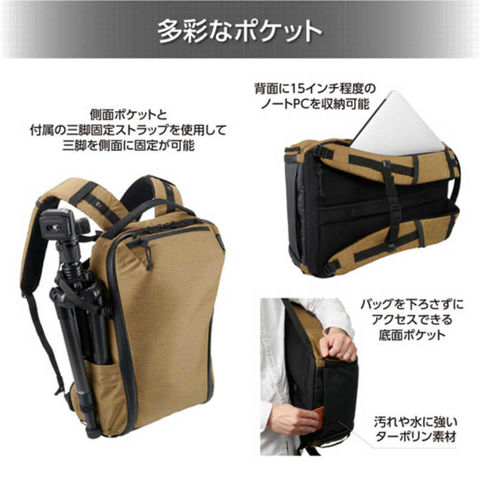 側面ポケットと付属の三脚固定ストラップを使用して三脚等を側面に固定することが可能です。