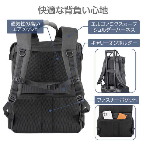 バッグを下さず両サイドから素早くアクセスが可能なカメラ収納部を備えたビジネスリュック風デザインのスリムなトートバックパックです。