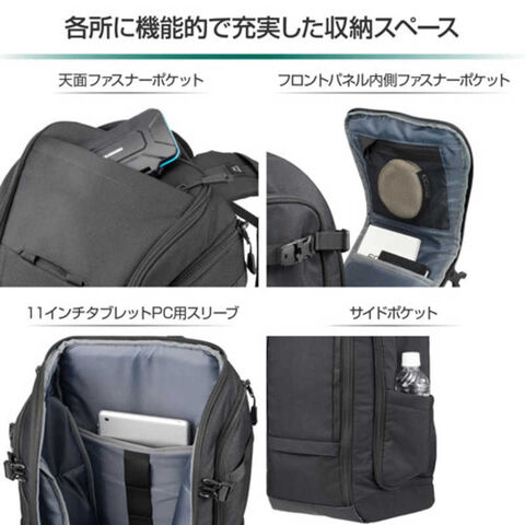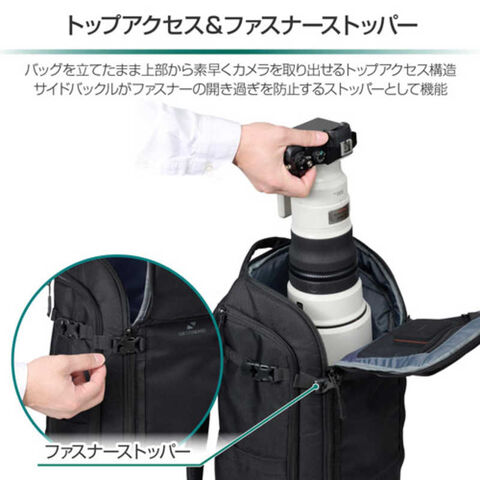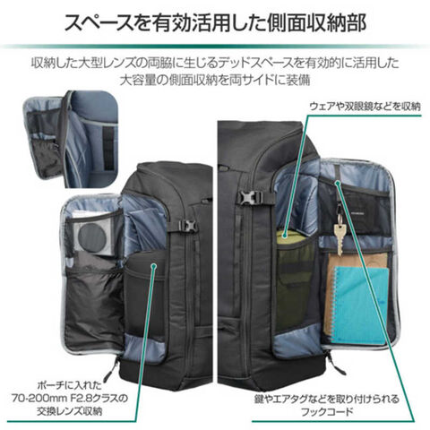大型レンズを運搬するために専用設計され、300mmF2.8クラスの大口径望遠レンズを装着したプロ用一眼カメラをそのまま収納できるバックパックです。収納内部のスペース効率を追求したデザインにより、スリムながら大型レンズ以外の機材やアクセサリーなども収納できる大容量の側面収納部を備えています。