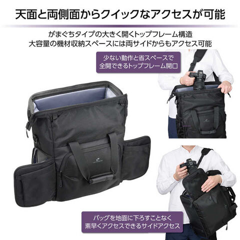 がまぐちタイプの大きく開くトップフレーム構造で機材の出し入れがしやすく、大容量の機材収納スペースは両サイドからもアクセス可能。