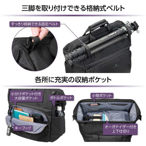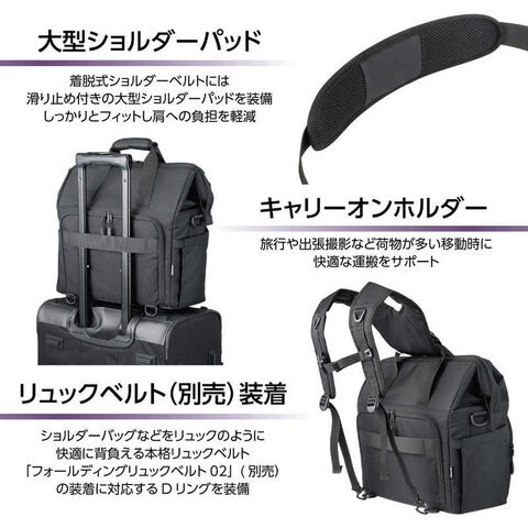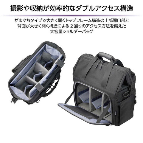 撮影スタイルに合わせて自在にアクセスできるダブルアクセス構造により、機材の出し入れから整理まで、従来のカメラショルダーバッグにはない、快適さと効率性を実現しています。