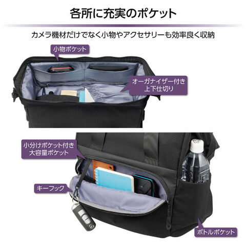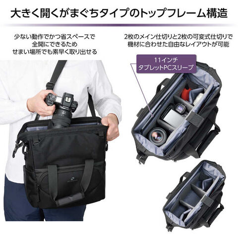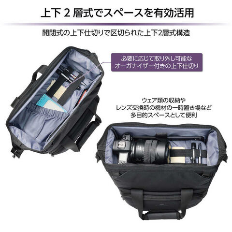 広い開口部でカメラ機材を一覧しやすく、出し入れもスムーズ。