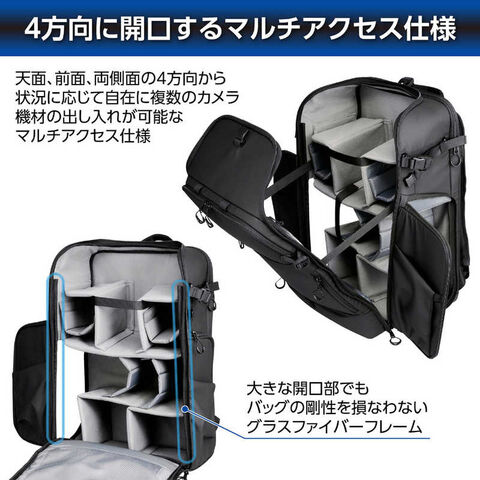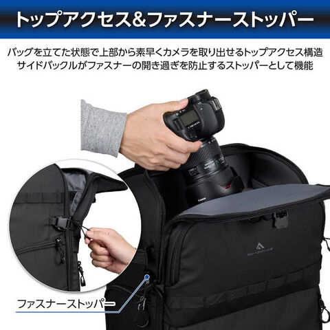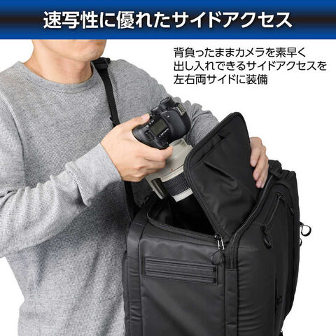 天面からフロントパネルにかけてフルオープンする大容量収納部に、地面に下ろさずに素早くカメラを出し入れできるサイドアクセス機構を左右両側に備えた、収納力と機動性を併せ持つバックパックです。