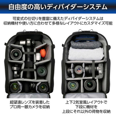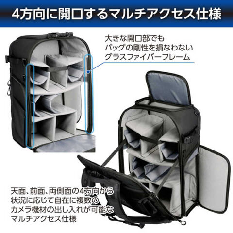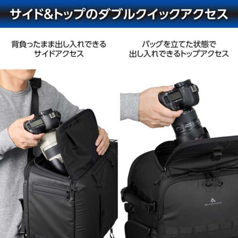 機材の出し入れや内装のカスタマイズがしやすい背面フルオープン式の大容量収納部に、天面、両サイドから状況に応じて自在にアクセスできるマルチアクセス仕様のバックパックです。