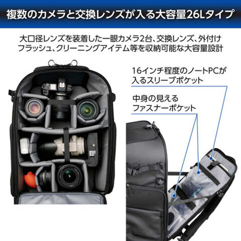 仕様1:メイン収納部は、大口径レンズを装着した一眼カメラ2台、交換レンズ、外付けフラッシュ、クリーニングアイテム等を収納可能な大容量設計です。