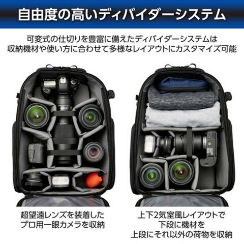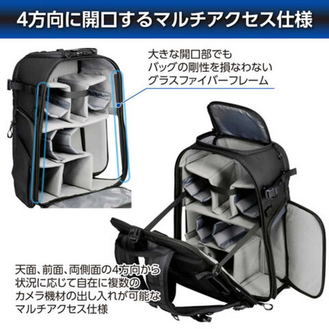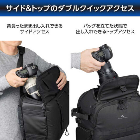 機材の出し入れや内装のカスタマイズがしやすい背面フルオープン式の大容量収納部に、天面、両サイドから状況に応じて自在にアクセスできるマルチアクセス仕様のバックパックです。