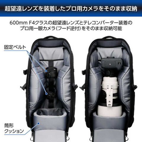 大型レンズを運搬するために専用設計され、600mm F4クラスの超望遠レンズとテレコンバーターを装着したプロ用一眼カメラをフード逆付けでそのまま収納が可能な大容量バックパックです。