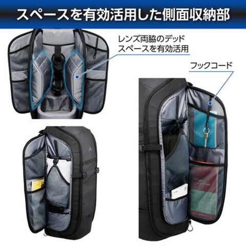 カメラボディや交換レンズ、ウェアなども収納可能な大容量の側面収納部を備えながら、徹底したスペースの有効活用によりスリムなデザインを実現しています。