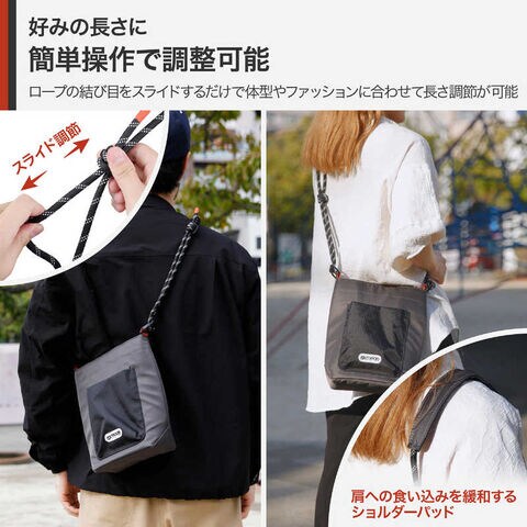 ロープ状のショルダーストラップと、ビビッドなアクセントカラーを散りばめた遊び心あふれるデザインは、フェスやキャンプなどアクティブなレジャーシーンにもぴったりです。