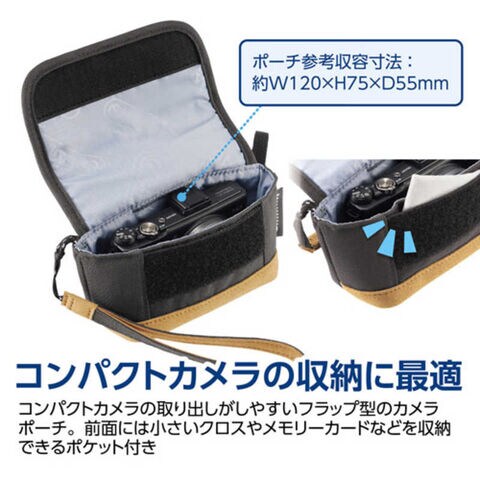 コンパクトカメラの取り出しがしやすいフラップ型のカメラポーチです。前面には小さいクロスやメモリーカードなどを収納できるポケット付きです。