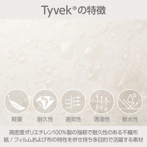 Tyvek(R)は高密度ポリエチレン100%製の強靭で耐久性のある不織布で、紙、フィルムおよび布の特性を併せ持ち多目的で活躍する素材です。