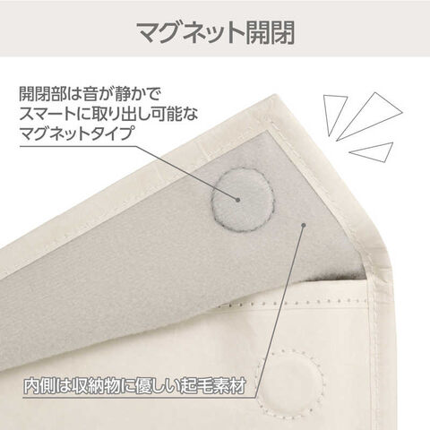 開閉部は、面ファスナーに比べ音が静かでスマートに取り出し可能なマグネットタイプを採用しています。内側は収納物に優しい起毛素材です。