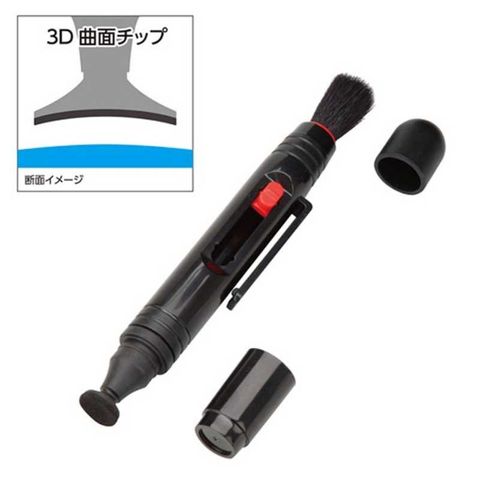 片側が柔らかいブラシ、もう一方がセーム革とカーボン粉末が先端に付いたペン型のレンズクリーナーです。3D曲面のチップがレンズの曲面にフィットし指紋汚れを除去します。
