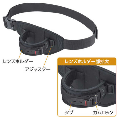 一眼カメラを首や肩にかけて携行する際の揺れを防止する、軽量なカメラホルスターです。カメラの重量を腰で支えることで、首や肩にかかる負担を軽減し快適に携行できます。カムロック付きのレンズホルダーにより、カメラのホールドとリリースを素早く簡単に行うことができます。