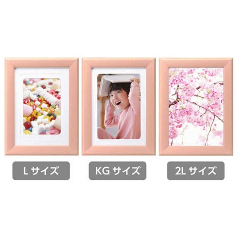 3サイズの写真に対応可能な木製カラーフレーム。2Lサイズの写真の他に、付属のマット紙を使えばLサイズやKG(ハガキ)サイズにも対応します。