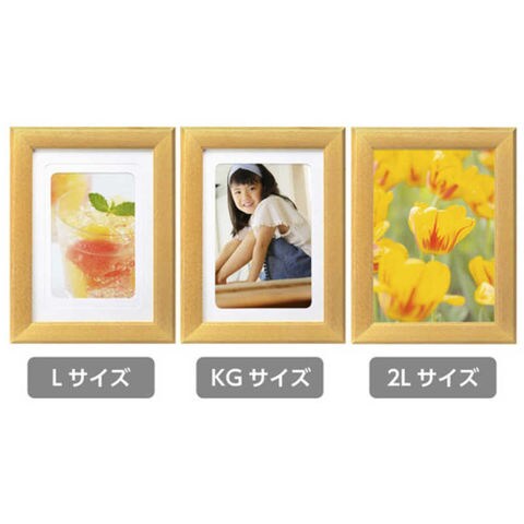 3サイズの写真に対応可能な木製カラーフレーム。2Lサイズの写真の他に、付属のマット紙を使えばLサイズやKG(ハガキ)サイズにも対応します。