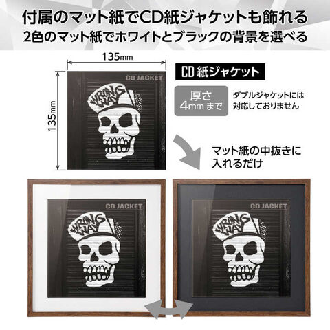付属の背景マット紙を使用してレコード盤をそのまま飾ることもでき、CDの紙ジャケット(135mm角)を飾れる専用マット紙も付属しています。