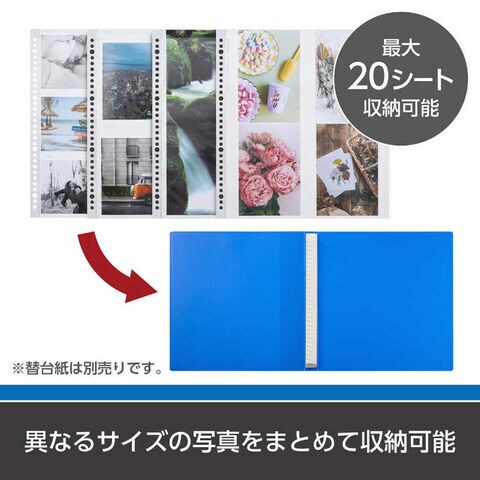 別売りのLサイズ用替台紙を追加して、収納枚数を増やしたり、Lサイズだけではなく2Lや4切、ポストカードサイズ用の替台紙を追加することで、異なるサイズのお写真を一緒に1冊のファイルとしてまとめることもできます。