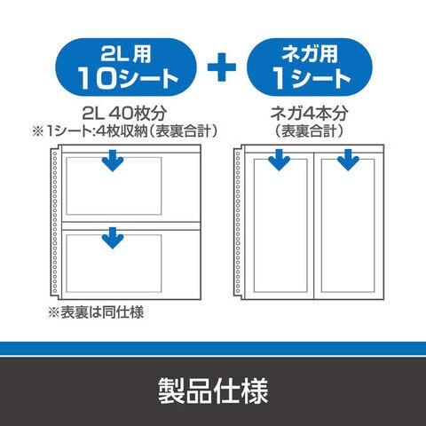 仕様3:シート数 : 2Lサイズ用10シート、ネガフィルム用1シート(2Lサイズ用1シートあたり両面合わせて4枚、ネガフィルム用4本収納可能)