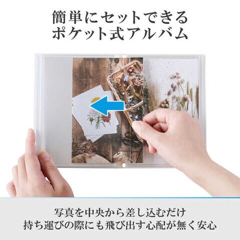 ポケット構造になっているので、表紙の写真をお気に入りの1 枚に入れ替えるだけで簡単にオリジナルのアルバムがつくれます。