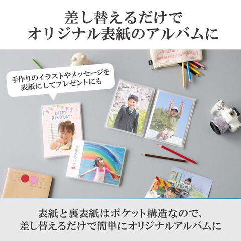 ポケット構造になっているので、表紙の写真をお気に入りの1 枚に入れ替えるだけで簡単にオリジナルのアルバムがつくれます。