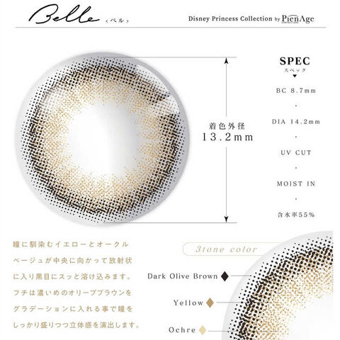 粧美堂 (度あり/-3.50) ディズニープリンセス by ピエナージュ イエロー×オリーブブラウン (BC8.7/DIA14.2) 6枚入 カラコン PA-DN93449