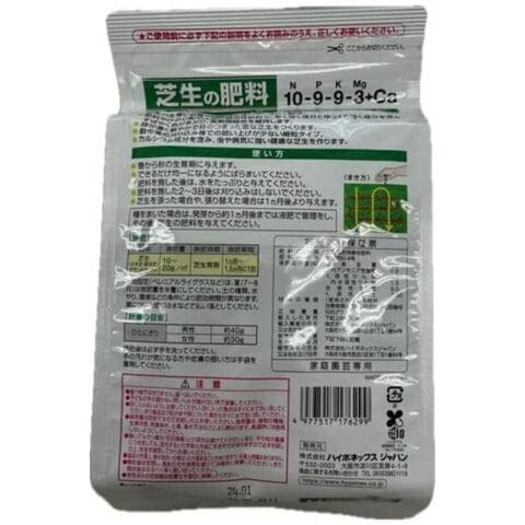 ・肥料焼けの心配が少ない緩効性肥料で、早く効く成分とゆっくり効く成分を含み、すばやく色があがり、長期間緑色を維持します。