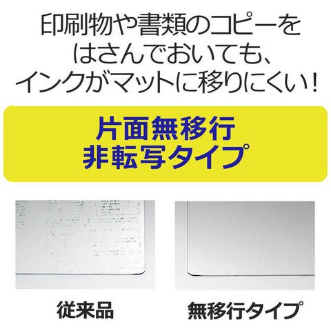 ・片面無移行(非転写)なので、印刷物や書類のコピーを長期間はさんでおいても、インクがマット面に移りにくい加工を施したデスクマット。