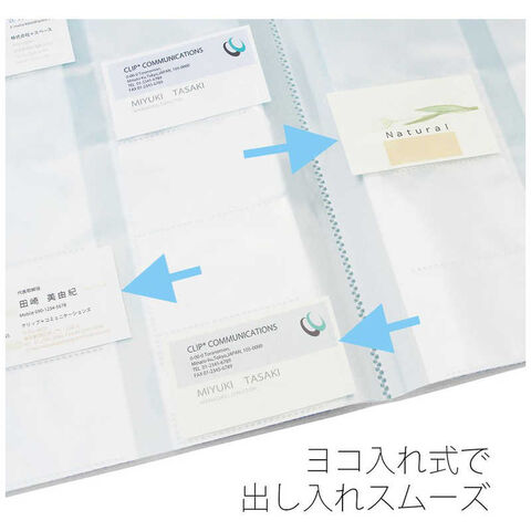 ・見開きで20枚の名刺が見られる・溶着式で両面横入れ5段×2列ポケット10枚、20ページ(200名用)・クリアーホケットはエンボスタイプ。
