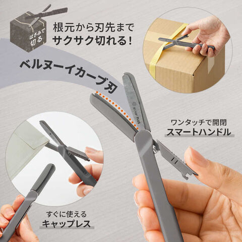 はさみ部分は、ベルヌーイカーブ刃によるサクサクとした快適な切れ味はそのままに、更にキャップレス仕様でさっと使える手軽さと、樹脂カバーやセーフティロックによる安全性を両立。