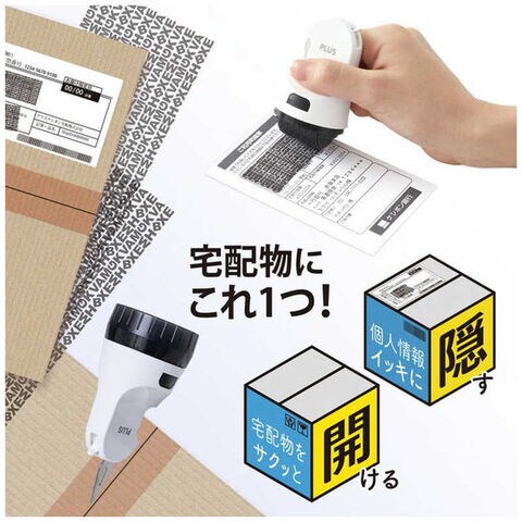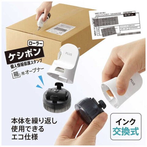 段ボールなどの宅配物の「開梱」と「個人情報」を隠す2つの動作をスムーズに行えるローラーケシポンのインク交換式タイプ。