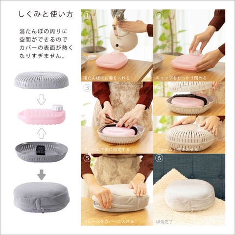 湯たんぽカバーは、肌ざわりのよい生地を使用し、内側の柔軟なフレームと合わせて使用することで、湯たんぽの硬さを感じることなく使用できます。